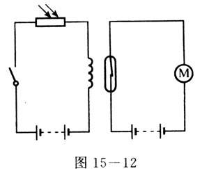 图15-10是应用光敏电阻的基本电路、电路中的光敏电阻受到光照射时,电流相当强,用电器可以正常工作.而当光敏电阻不受光照射时,阻值增大,电流减弱,用电器停地工作。下面举两个具体例子。